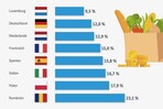 Auch im Vergleich mit den europäischen Nachbarn sind die Ausgaben für Nahrungsmittel relativ gering. Zwar ist der Anteil hierzulande gegenüber dem Vorjahr von 10,8 auf 12 % gestiegen, damit liegt Deutschland aber dennoch unter dem EU-Durchschnitt. Nur in Luxemburg (9,5 %), Irland (9,8 %) und Österreich (11,3 %) geben die Menschen anteilig weniger für Nahrungsmittel aus. Besonders hoch fällt der Anteil in vielen (süd)osteuropäischen Staaten aus, allen voran Rumänien, wo die Menschen beinahe ein Viertel ihrer Haushaltsausgaben für Nahrungsmittel aufwenden.