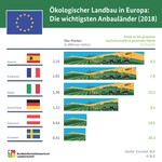 Unter den EU-Ländern hat Deutschland die viertgrößte Öko-Anbaufläche. Spitzenreiter ist hier Spanien. Dort werden – ähnlich wie bei uns – gut 9 Prozent der gesamten landwirtschaftlich genutzten Fläche ökologisch bewirtschaftet. Zu den Öko-Vorreitern in der EU zählt Österreich, wo auf beinahe einem Viertel der landwirtschaftlichen Fläche Ökolandbau betrieben wird.