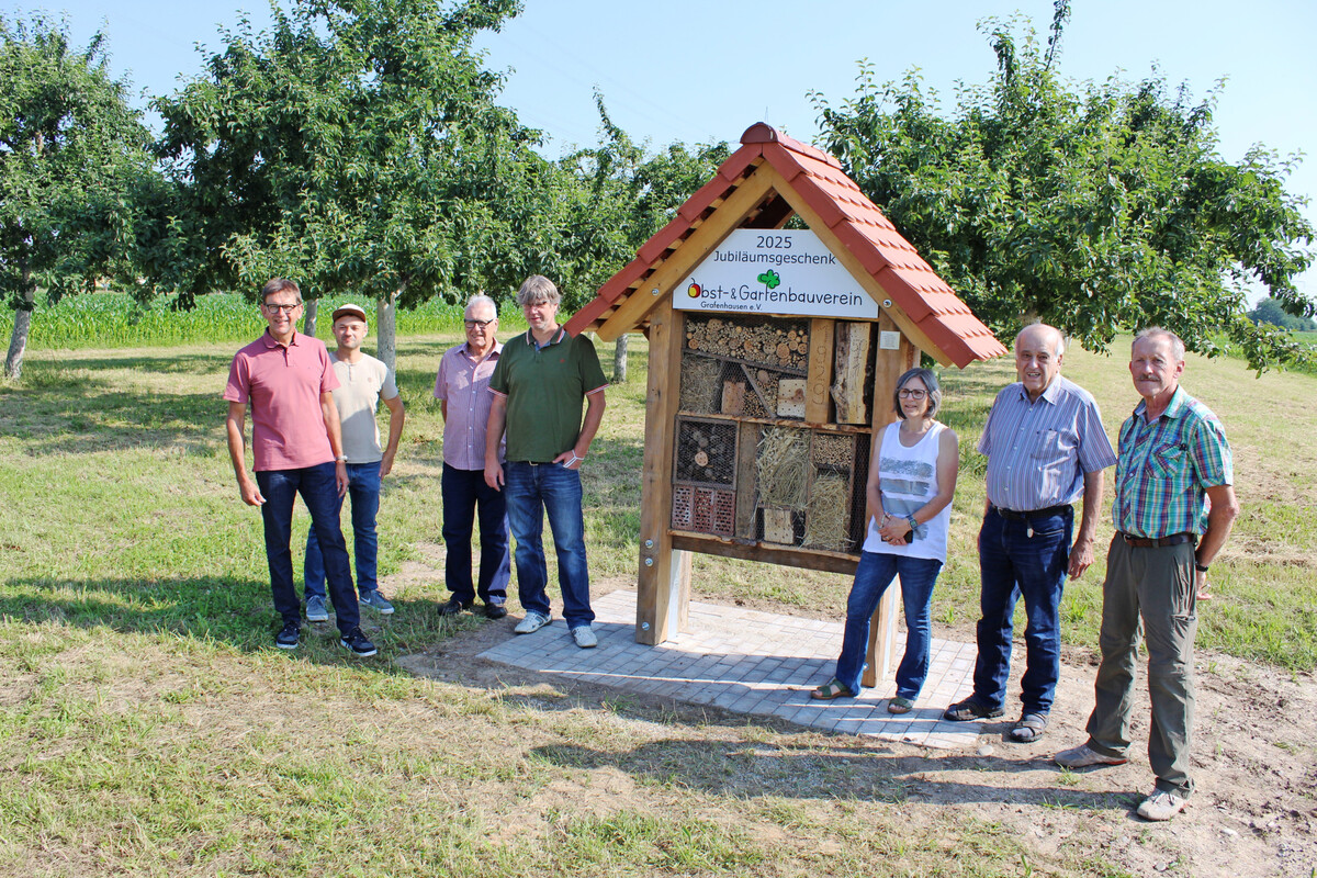 von OGV Grafenhausen/Rudi Rest erschienen am 07.10.2025So hatte die Vorstandschaft des OGV Grafenhausen die Idee, ein Insektenhotel zu bauen. Dies soll dann auf der Jubiläumswiese zwischen beiden Ortsteilen, welche vor 25 Jahren mit vielen Apfelbäumen angelegt wurde, ihren Platz finden. Eine genaue Planung Voraussetzung, schließlich sollte die Bauform des Insektenhotels ähnlich der bereits auf der Jubiläumswiese befindlichen Infotafeln werden. Mit fachlichem Rat wurde man vom Bauamt und Bauhof der Gemeinde unbürokratisch unterstützt. Nachdem der Baukörper fertig war, ging es um die einzelnen unterschiedlichen Behausungen der Insekten. Verschiedene mit Löchern versehene Holzteile, Steine, Röhren aller Art und Durchmesser, Schilf, Stroh und Lehm wurden dabei verwendet und eingebaut. Zur Festeröffnung im Mai wurde das Insektenhotel an Bürgermeister Philipp Klotz übergeben. „Von der Planung bis zu Fertigstellung waren einige Abende Planung und Arbeitseinsatz der gesamten Vorstandschaft nötig, hat aber allen viel Spaß gemacht“, so der Vorsitzende Bernhard Köbele bei der offiziellen Übergabe. Nach dem Jubiläumsfest wurde das Insektenhotel an seinem endgültigen Standort aufgestellt. Beim Eindecken des Daches mit Biberschwanzziegeln wurde festgestellt, dass schon die ersten Insekten ihr Quartier bezogen hatten.