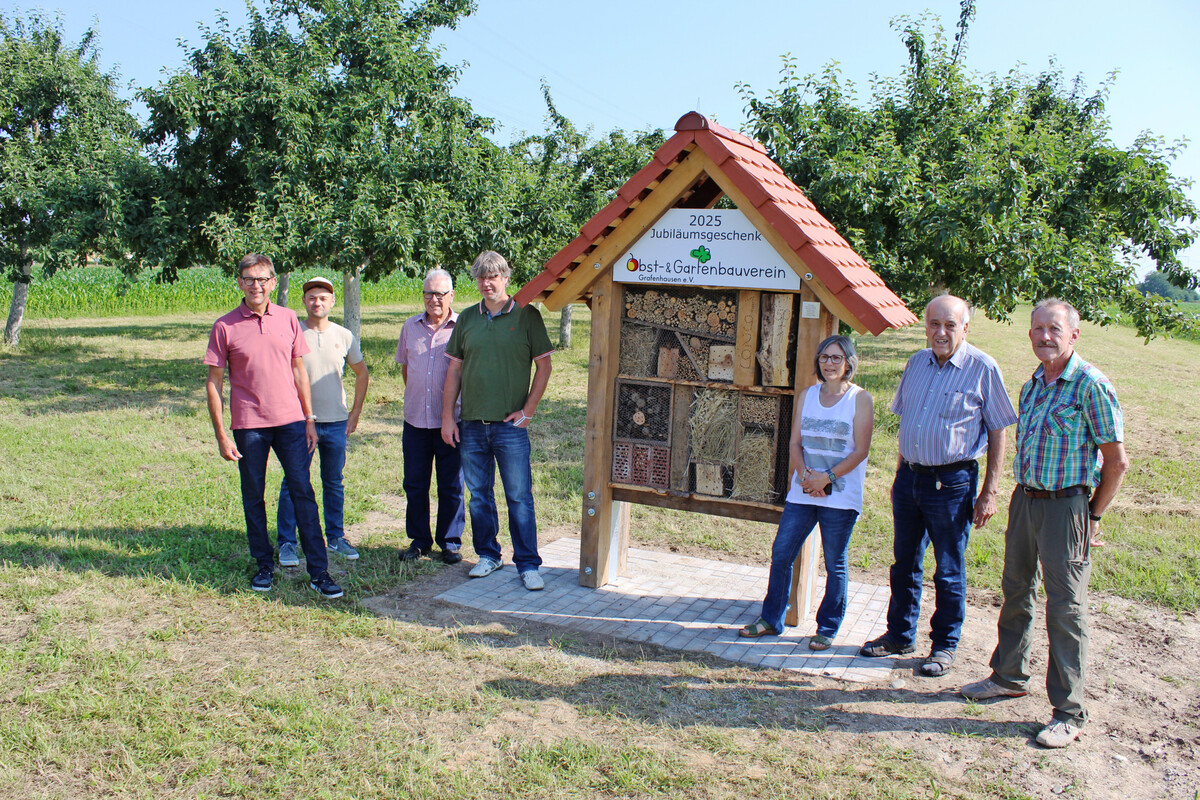 von OGV Grafenhausen/Rudi Rest erschienen am 07.10.2025So hatte die Vorstandschaft des OGV Grafenhausen die Idee, ein Insektenhotel zu bauen. Dies soll dann auf der Jubiläumswiese zwischen beiden Ortsteilen, welche vor 25 Jahren mit vielen Apfelbäumen angelegt wurde, ihren Platz finden. Eine genaue Planung war Voraussetzung. Schließlich sollte die Bauform des Insektenhotels ähnlich der bereits auf der Jubiläumswiese befindlichen Infotafeln werden. Mit fachlichem Rat wurde man vom Bauamt und Bauhof der Gemeinde unbürokratisch unterstützt.