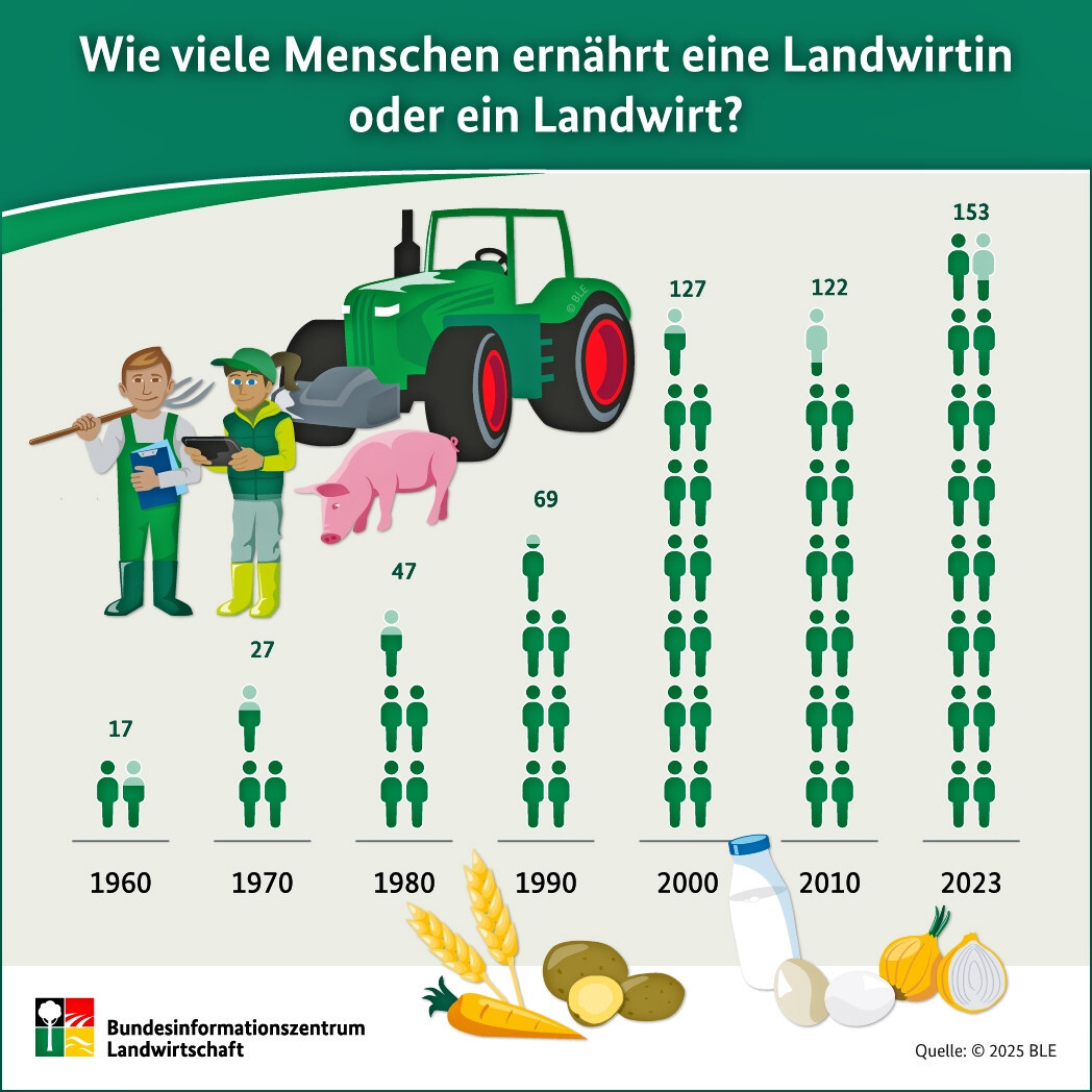 In Deutschland kann eine Landwirtin oder ein Landwirt inzwischen 153 Menschen ernähren – das ist eine Person mehr als im Jahr 2022 und ein Rekordwert seitdem die Versorgungsleistung der heimischen Landwirtschaft erfasst wird.