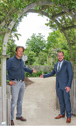 Geschäftsführer Thomas Neder und Landrat Sebastian Straubel heißen Besucher im Obstlehrgarten in Coburg willkommen, der unter dem Motto „Obstanbau für kleine Hausgärten" steht.